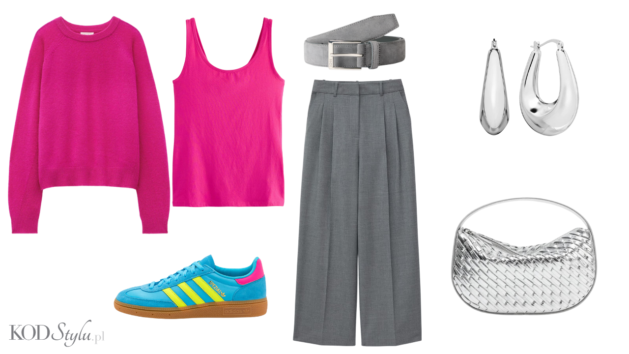 Dla czystej wiosny szarość to kolor, który powinien pojawiać się z umiarem. Zdecydowanie nie przy twarzy, bo może odbierać jej naturalny blask i świeżość. Dlatego w tej stylizacji szare spodnie są jedynie tłem, które pozwala wybrzmieć mocnej czerwieni i złotym akcentom. To właśnie one nadają całości życia, kontrastu, których wiosna potrzebuje.