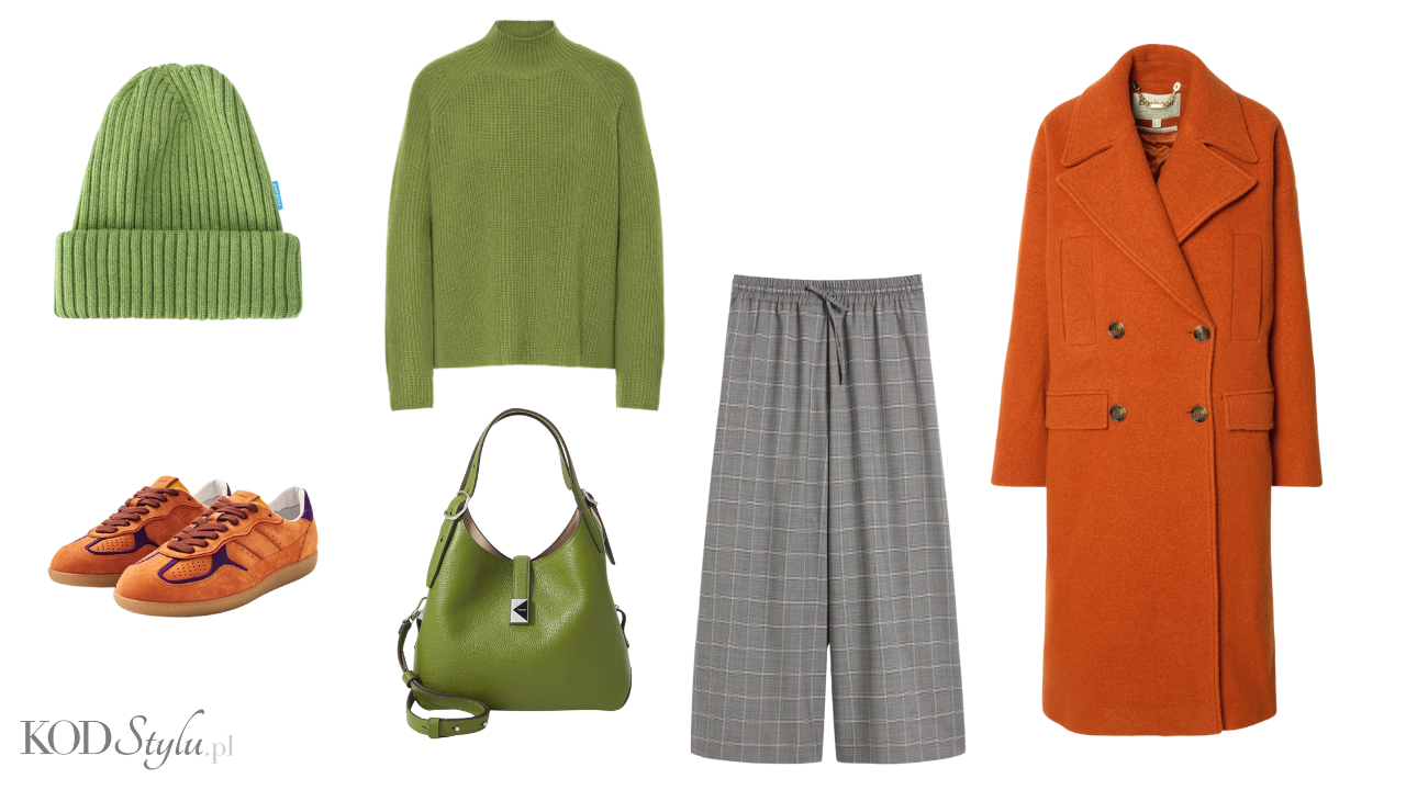 Na sam koniec zostawiłam Ciepłą Wiosnę, bo to właśnie dla niej szarość jest jednym z najmniej korzystnych kolorów. Potrafi całkowicie zgasić jej świeżość, blask i energię. Ale! Nawet tutaj da się znaleźć sposób, by szarość zagrała z temperamentem tego typu kolorystycznego. Zdecydowałam się na szare spodnie przełamane beżem, które nie są chłodne ani „surowe” w odbiorze. Dzięki temu mogą posłużyć jako w miarę neutralna baza, nie odbierając ciepłej wiośnie jej naturalnego blasku. Całość połączyłam z soczystą zielenią i pomarańczem. Idealne odcienie z palety tchną życie w stylizację, dodają lekkości i energii. W ten sposób powstał look, który mimo obecności szarości wciąż pozostaje pełen wiosennej świeżości.