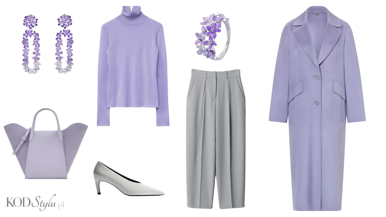 Dla Jasnego Lata szarość to kolor, który potrafi być prawdziwym sprzymierzeńcem pod warunkiem, że nie jest zbyt ciemna ani chłodno-surowa. Najlepiej sprawdzają się delikatne, rozbielone odcienie, takie jak gołębia szarość, mglisty popiel czy jasne srebro. Moja propozycja to połączenie z jasnym fioletem: