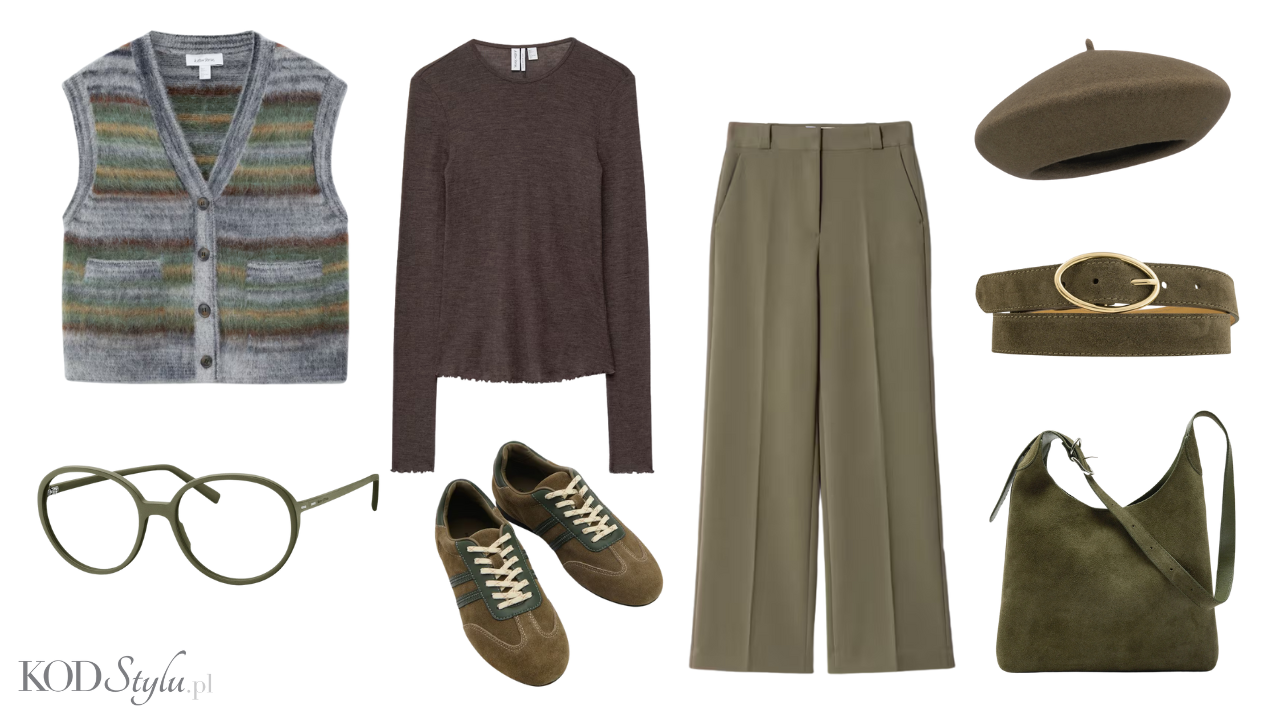 [kamizelka, sweter, buty, spodnie, beret, okulary, pasek, torebka]